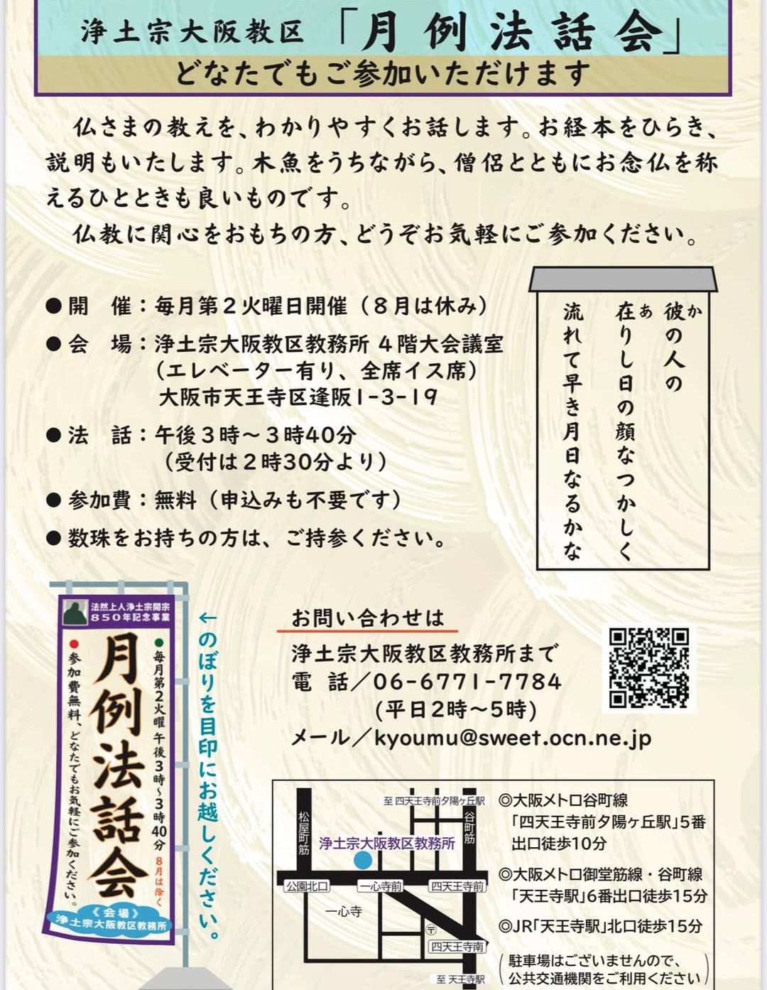 お坊さんの話を聞いてみませんか? 2026年1月23日 先日、浄土宗大阪教区「月例法話会」の担当を勤めさていただきました。 今年一年を、ただひたすらお念仏にお称えする一年にしたい。 そんな思いで、当日は「専修念仏」の教えを取り次ぎいたしました。 次回の月例法話会は、 2月10日(火) 良運院 篠原多佳上人がご法話くださいます。 どなたでもご参加いただけます。 皆さまのお越しを心よりお待ちしております。合掌